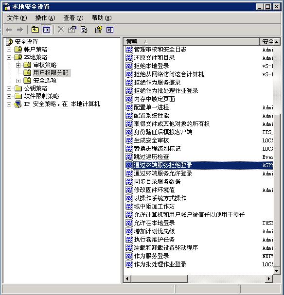 windows2003下禁止用戶遠程登錄的方法 來源:夢飛科技 作者:夢飛 瀏覽量:214 2015-09-15 0 windows2003下禁止用戶遠程登錄的方法如下: 打開控制面板 > 管理工具 > 本地安全策略 安全策略-->本地策略-->用戶權限分配-->通過終端服務拒絕登錄,在里面添加想要禁止遠程的用戶可以達到讓這個賬戶無法遠程